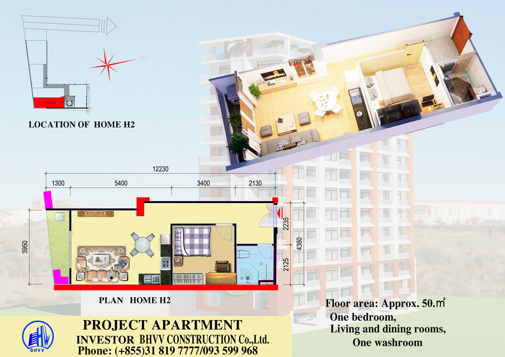 Căn hộ H2 có diện tích xấp xỉ 50 m2 .Có một phòng ngủ , phòng khách , bếp , và một phòng vệ sinh.Có ban công đặt máy giặt và phơi áo quần thuận tiện . Để biết thêm chi tiết , vui lòng liên hệ số điện thoại : +855318197777
